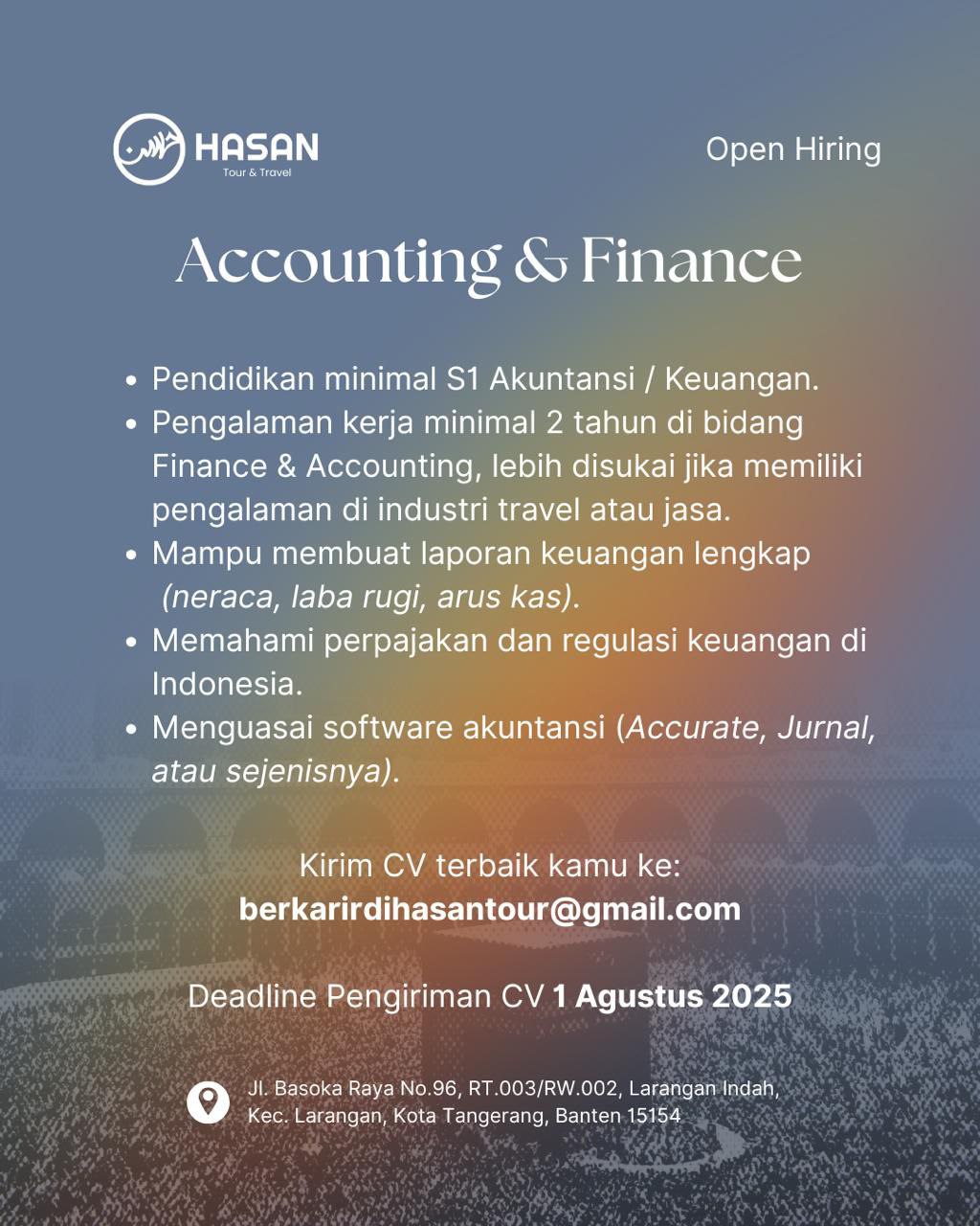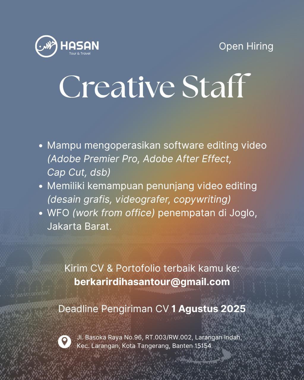kirim Porto (untuk Creatiff Staff) dan CV ke alamat email : berkarirdihasantour@gmail.com