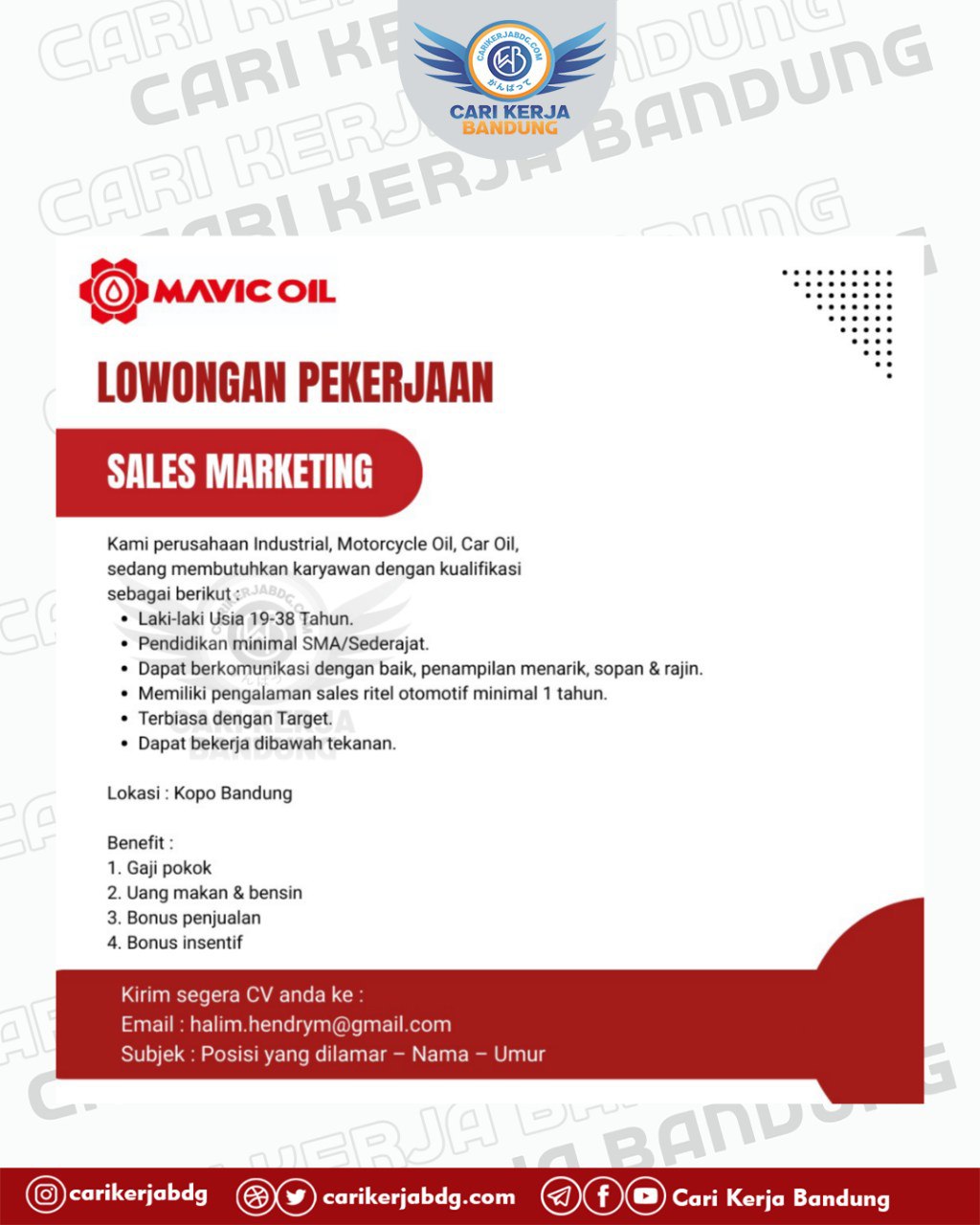 MAVIC OIL lagi buka lowongan !! Yukk gabung dan jadi bagian dari tim kita untuk Posisi Sales Marketing,