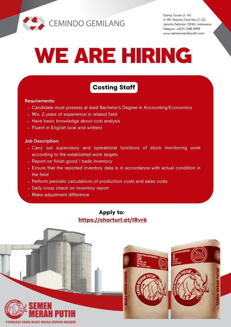 PT Cemindo Gemilang Tbk (Semen Merah Putih) is currently looking for “Costing Staff” role to join our team.