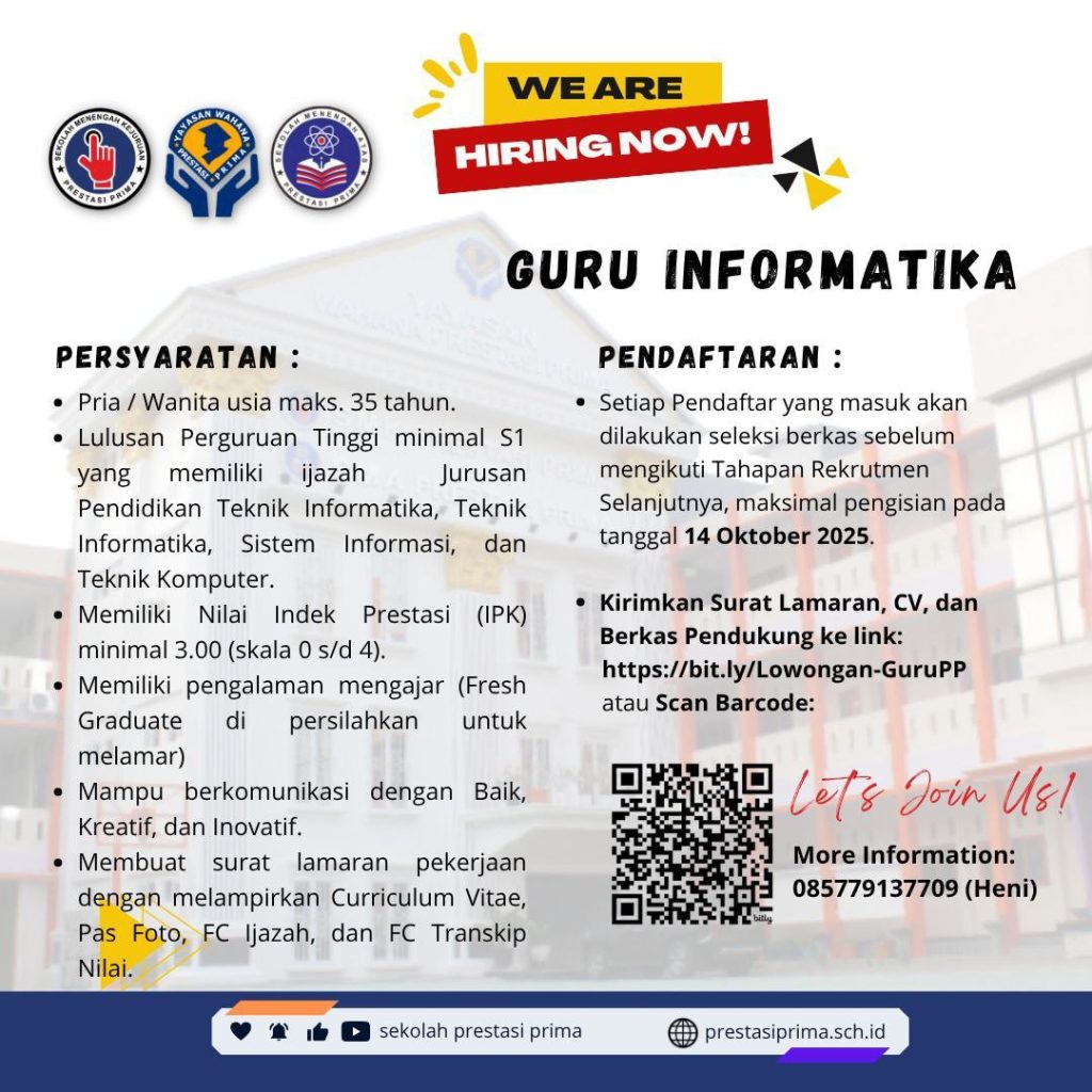 Sekolah Prestasi Prima membuka kesempatan kepada seluruh warga Negara Indonesia untuk mengikuti seleksi sebagai Guru Informatika Sekolah Prestasi Prima Tahun Pelajaran 2025/2026, yang memiliki karakter kerja keras, kreatif, inovatif, dan Pancasilais.
